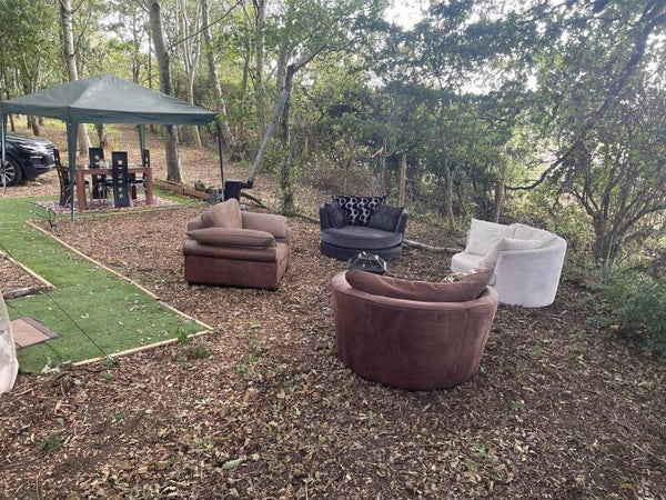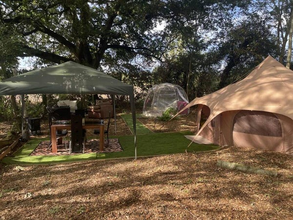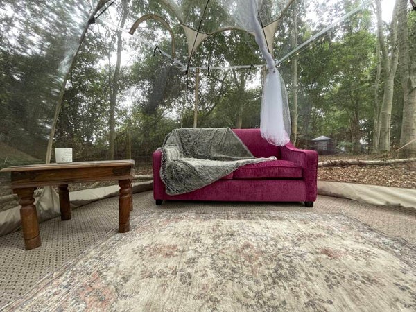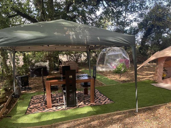 Your area comes with a bell tent (sleeps 2), bubble tent (sleeps 2), 4 cuddle chairs and a fire pit. Heating and electricty. Your dining area has a woodburner to take the chill away for your comfort.